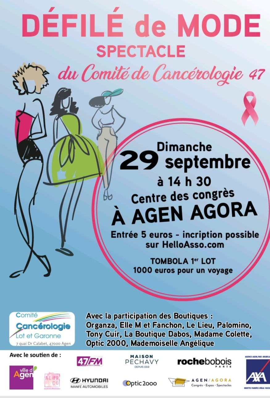 9 boutiques agenaises seront présentes, des artistes locaux viendront faire de ce défilé un spectacle, 6 sponsors apportent leur soutien financier et 12 partenaires donateurs alimentent en lots notre tombola : c’est bien grâce à cette aide précieuse que notre action peut perdurer.