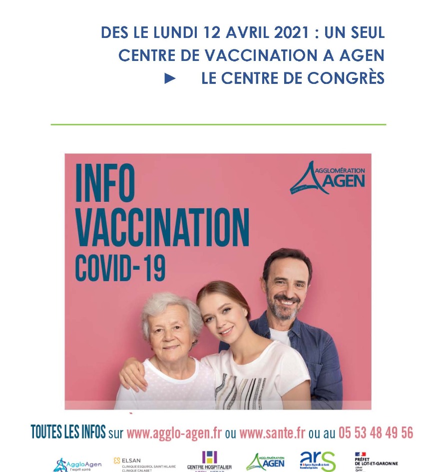 Afin d’accélérer la campagne de vaccination, les 3 centres de vaccination d’Agen (Le Centre de Congrès, le Centre Hospitalier Agen Nérac et la Clinique Saint Hilaire ELSAN) se rapprochent.Plusieurs acteurs du territoire ont, ainsi et une nouvelle fois, coopéré et uni leurs forces pour ouvrir ce nouveau centre à Agen : l’Agence Régionale de Santé Nouvelle Aquitaine (ARS), l’Agglomération d’Agen, le Centre Hospitalier Agen Nérac, la Clinique Saint Hilaire ELSAN, les Unions Régionales des Professionnels de Santé (URPS) médecins et infirmiers, le Centre de Congrès et Mme Soussi représentante des infirmières.