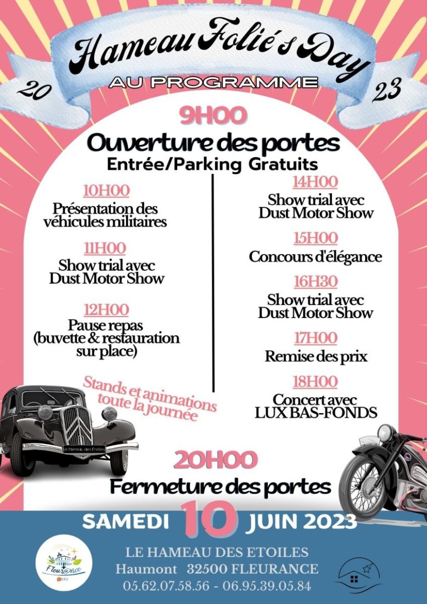 - Hameau Folie's Day - Autos et motos anciennes, show trial, concert, buvette et restauration - Hameau des étoiles - Samedi 10 juin 9h à 20h