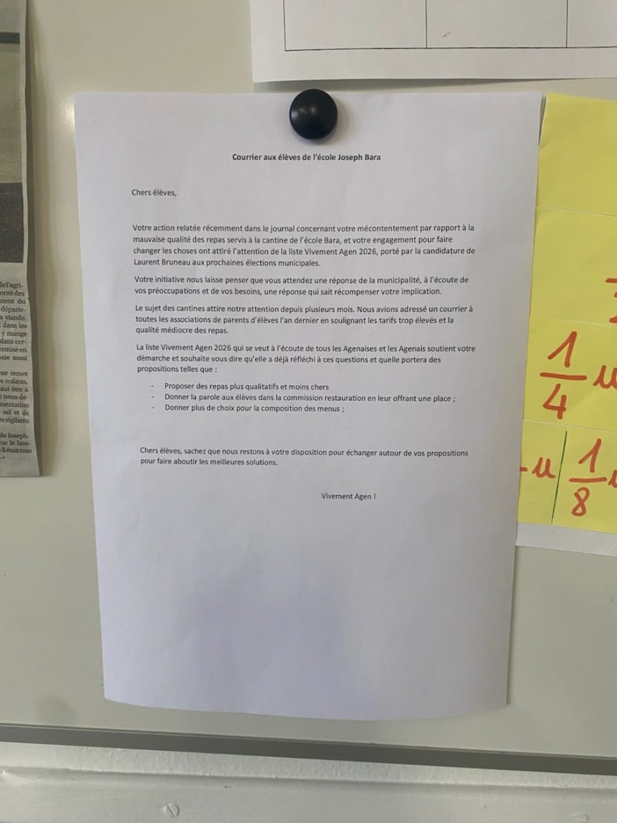 Hier, jeudi 5 mars, une affiche signée du nom de « Vivement Agen ! », celui de nos concurrents de la gauche-LFI, s’adressait de manière illégale, à l’intérieur d’une école agenaise, directement à des élèves mineurs âgés de moins de 12 ans, en répondant à une polémique douteuse datant de plus de deux mois et mettant en cause la qualité des repas scolaires.