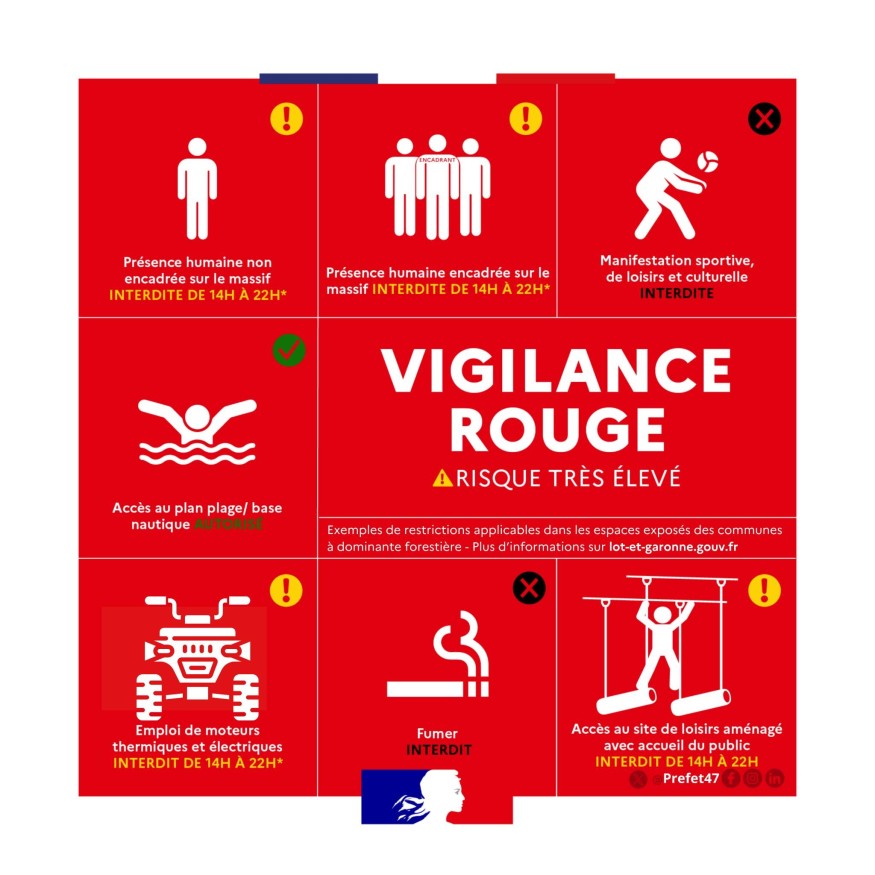 Compte-tenu de l’analyse de l’état de la végétation et en concertation avec le comité d’experts, le préfet de Lot-et-Garonne a décidé que, à compter du jeudi 14 août à 00h00, la vigilance pour la prévention des incendies de forêt dans le département de Lot-et-Garonne passe au niveau très élevé (rouge/niveau 4 sur une échelle de 5). Le niveau de vigilance sera ré-évalué en début de semaine prochaine.