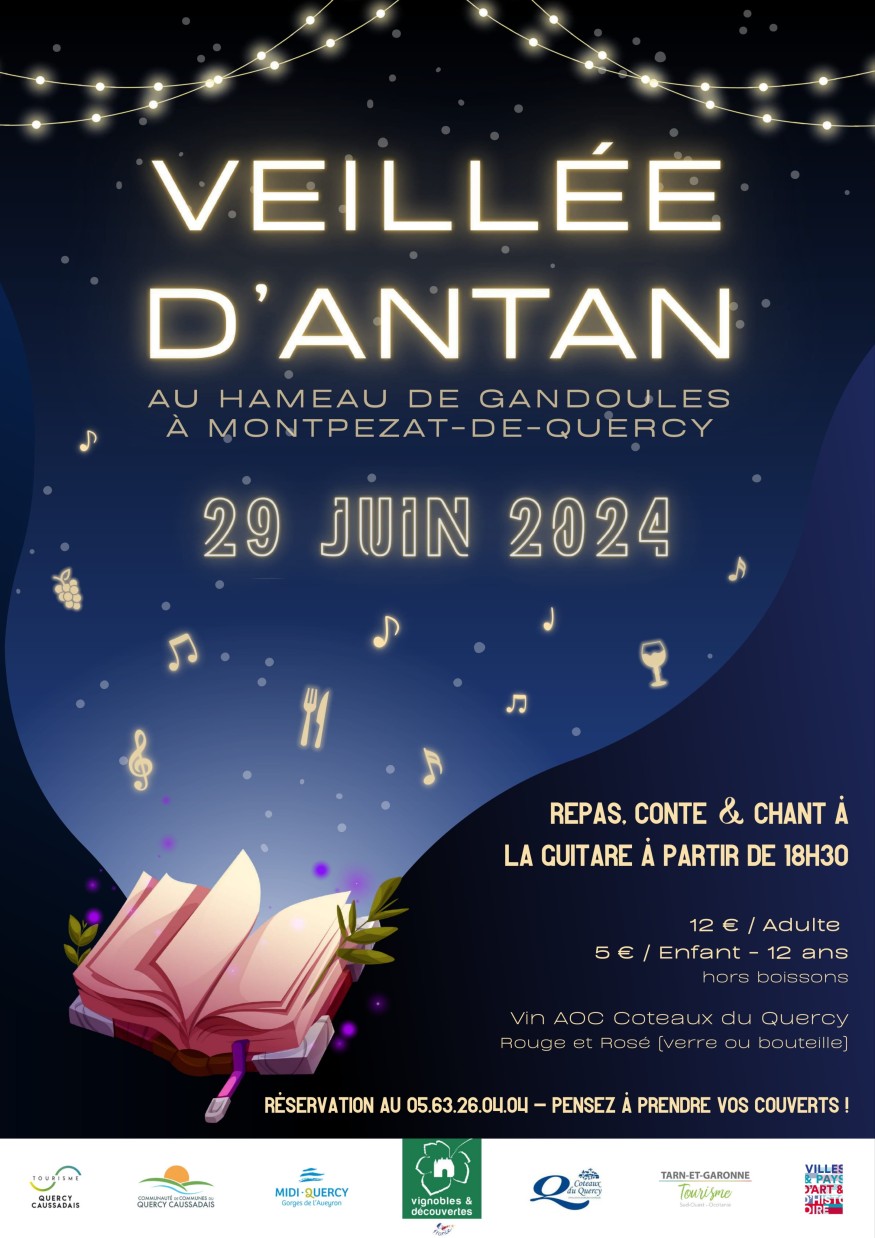 Revivons les Veillées d'Antan au Hameau de Gandoulès Jadis, afin d'occuper à bon escient les longues soirées d'hiver, les familles se retrouvaient généralement à chacune leur tour pour des veillées au coin du feu. On y échangeait les nouvelles du village et l'on racontait, de génération en génération, les riches histoires du passé. Pour célébrer l'arrivée de l'été et revivre l'ambiance chaleureuse des veillées d'antan, nous avons le plaisir de vous inviter à une soirée exceptionnelle. L'Office de Tourisme du Quercy Caussadais, le Pays d'Art et d'Histoire, le Syndicat des Vins des Coteaux du Quercy, Tarn et Garonne Tourisme et les Amis de Gandoulès vous attendent nombreux pour cette soirée d'antan, le samedi 29 juin à partir de 18h30, au hameau de Gandoulès. Programme de la Soirée Repas, contes et chants à la guitare rythmeront cette soirée conviviale, recréant la pure tradition des veillées d'antan. Ce sera l'occasion de partager des moments inoubliables, de découvrir ou redécouvrir des histoires locales et de profiter d'une atmosphère authentique et chaleureuse. Détails pratiques • Tarif : 12€ (hors boissons), 5€ pour les moins de 12 ans • Réservation : Obligatoire à l'Office de Tourisme au 05 63 26 04 04 • Remarque : Pensez à apporter vos couverts, un geste pour notre planète Venez nombreux partager cette soirée unique qui promet de raviver l'esprit des veillées d'autrefois et de renforcer les liens dans ce cadre unique qu'est le hameau de Gandoulès. Nous vous attendons avec impatience pour célébrer ensemble les traditions et l'arrivée de l'été dans une ambiance chaleureuse et festive. Pour plus d'informations, n'hésitez pas à contacter l'Office de Tourisme au 05 63 26 04 04 https://www.quercy-sud-ouest.com/fr