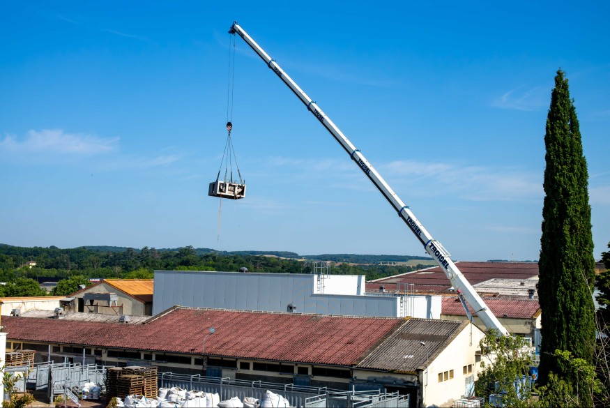 Pour ce faire, une grue de 130 tonnes a été déployée dans la cour de l’établissement. Les douze tonnes de matériel usagé ont dû être retirées par le toit du bâtiment. Cela a nécessité le déploiement de la flèche de 60 mètres pour atteindre une portée de 40 mètres au-dessus des bâtiments. Le matériel a été retiré en trois fois, la grue ne pouvant soulever plus de 5 tonnes à cette distance.