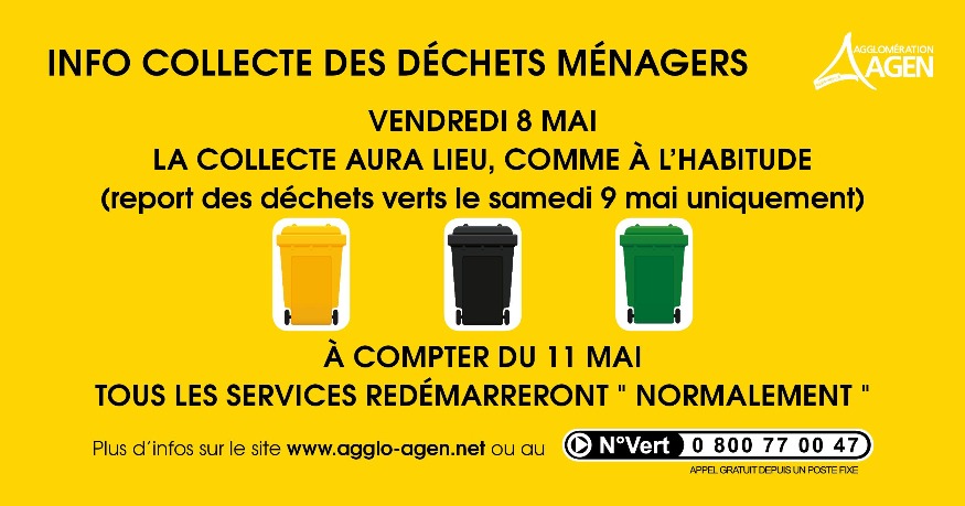 Si vous êtes concernés par une collecte de déchets verts le vendredi 8 mai, ils seront collectés le samedi 9 mai au matin