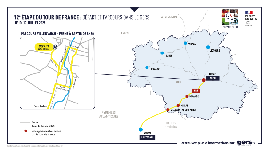nécessités locales. Les arrêtés pris par les collectivités sont consultables sur le site internet de la préfecture. Seuls les véhicules accrédités ou les véhicules de secours pourront, si nécessaire, emprunter le parcours. La circulation restera interdite entre le passage de la caravane et celui de la course.Itinéraire hors-course entre Auch et Chélan Des ralentissements sont à prévoir sur la D929, à partir de 13h00, en raison de l’itinéraire hors-course (500 voitures qui rallient Loudenvielle). Itinéraire conseillé via Haulies et Castelnau-Barbarens pour les véhicules légers venant du sud. Déviation obligatoire par Tirent-Pontéjac et Gimont pour les poids-lourds venant du sud. Stationnement interdit hors agglomération sur cet axe, entre Pavie et le giratoire de Robinson. Le rétablissement de la circulation s’effectuera dans l’heure qui suit le passage des coureurs.