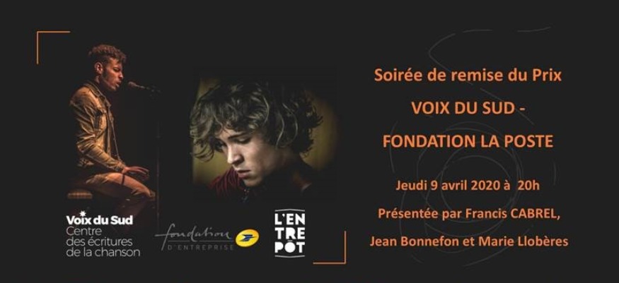 Chaque année Voix du Sud et la Fondation La Poste remettent un prix découverte à un artiste dont les talents particuliers ont été repérés durant les Rencontres d'Astaffort. Cette année, la désignation des lauréats a été particulièrement difficile. Finalement nous remettons deux prix au lieu d'un. Ce prix devait être remis à l'Entrepôt du Haillan le 9 avril. Nous n'avons pas souhaité reporter la soirée. Bref cette soirée de remise de Prix prend une forme particulière dans le contexte actuel. http://www.voixdusud.com/