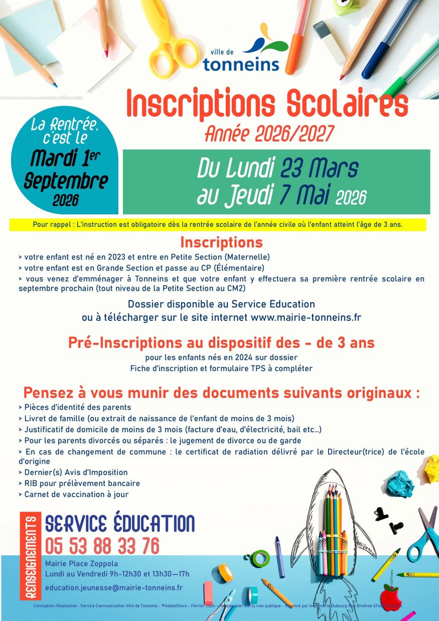 La Ville de TONNEINS rappelle aux familles que la campagne d’inscription scolaire pour la rentrée 2026/2027 se poursuit jusqu’au 7 Mai 2026.