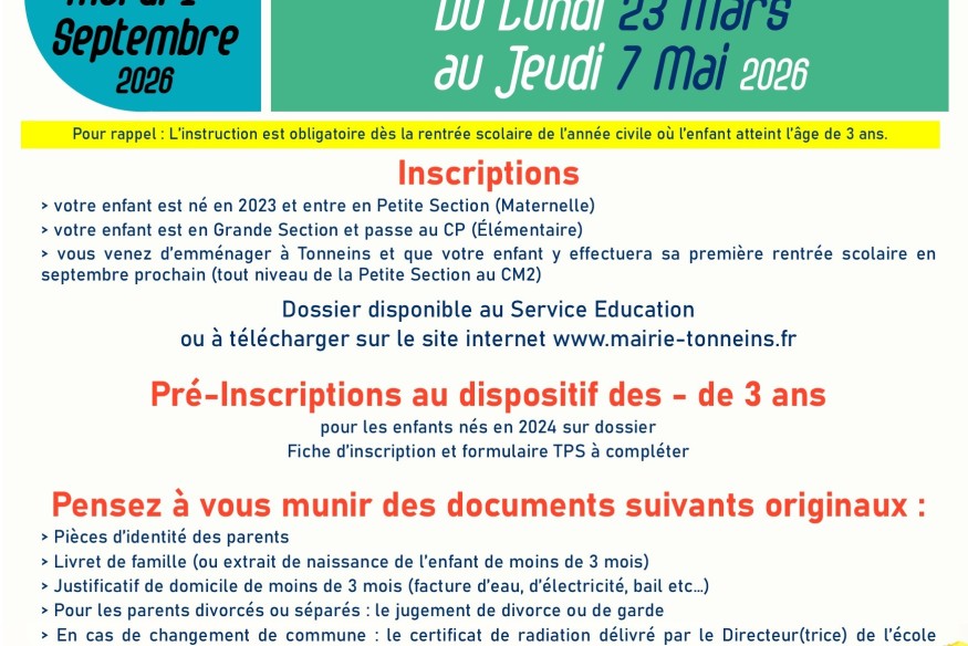 Tonneins : campagne d’inscription scolaire pour la rentrée 2026/2027 se poursuit jusqu’au 7 Mai 2026.